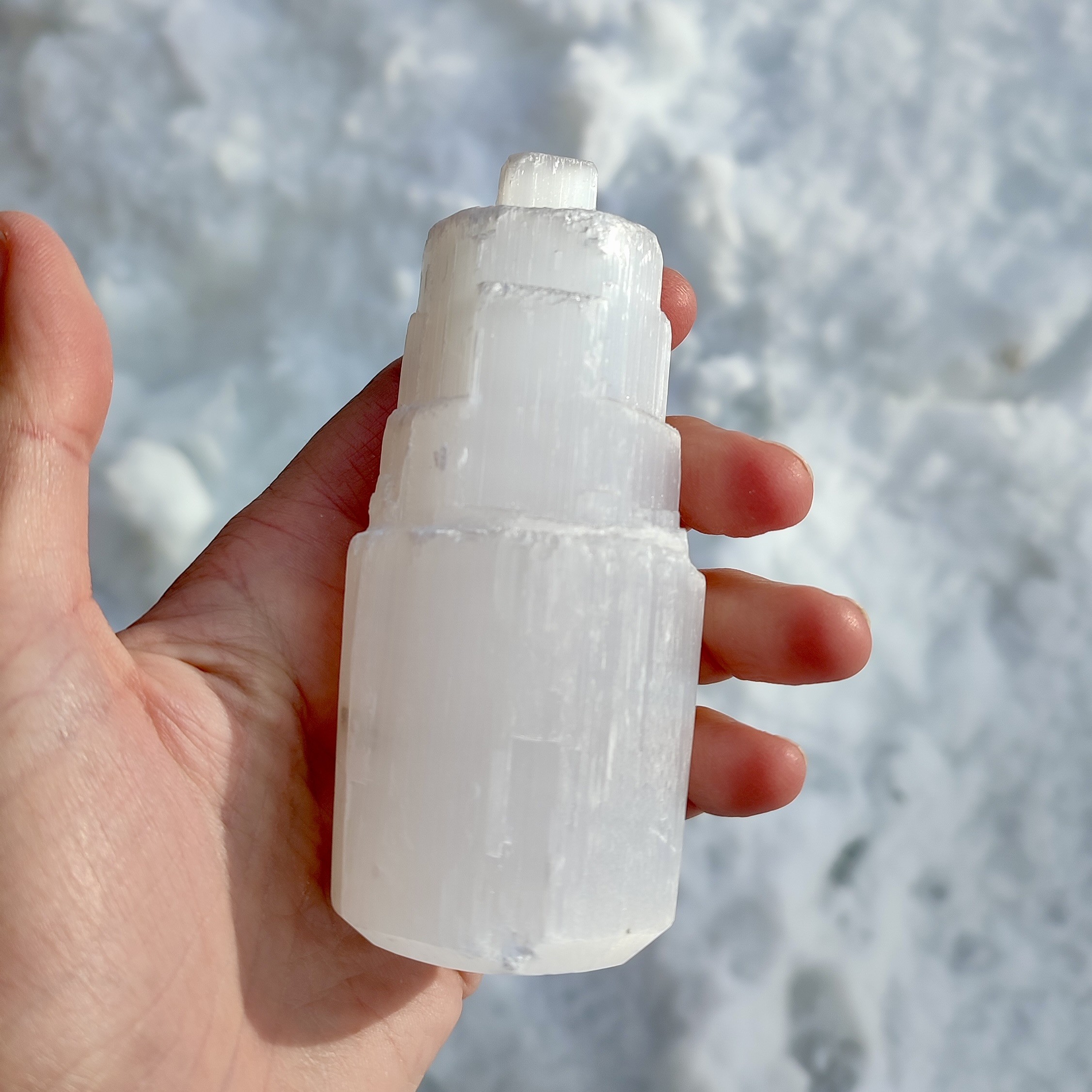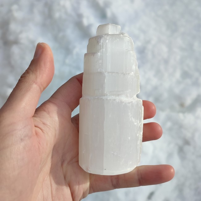 La Sélénite aide à apaiser le mental, à réaligner les dispersions de l’esprit et à clarifier les pensées. Elle soutient la réception des intuitions et des informations subtiles, agissant comme un véritable canal de clarté et de guidance intérieure.