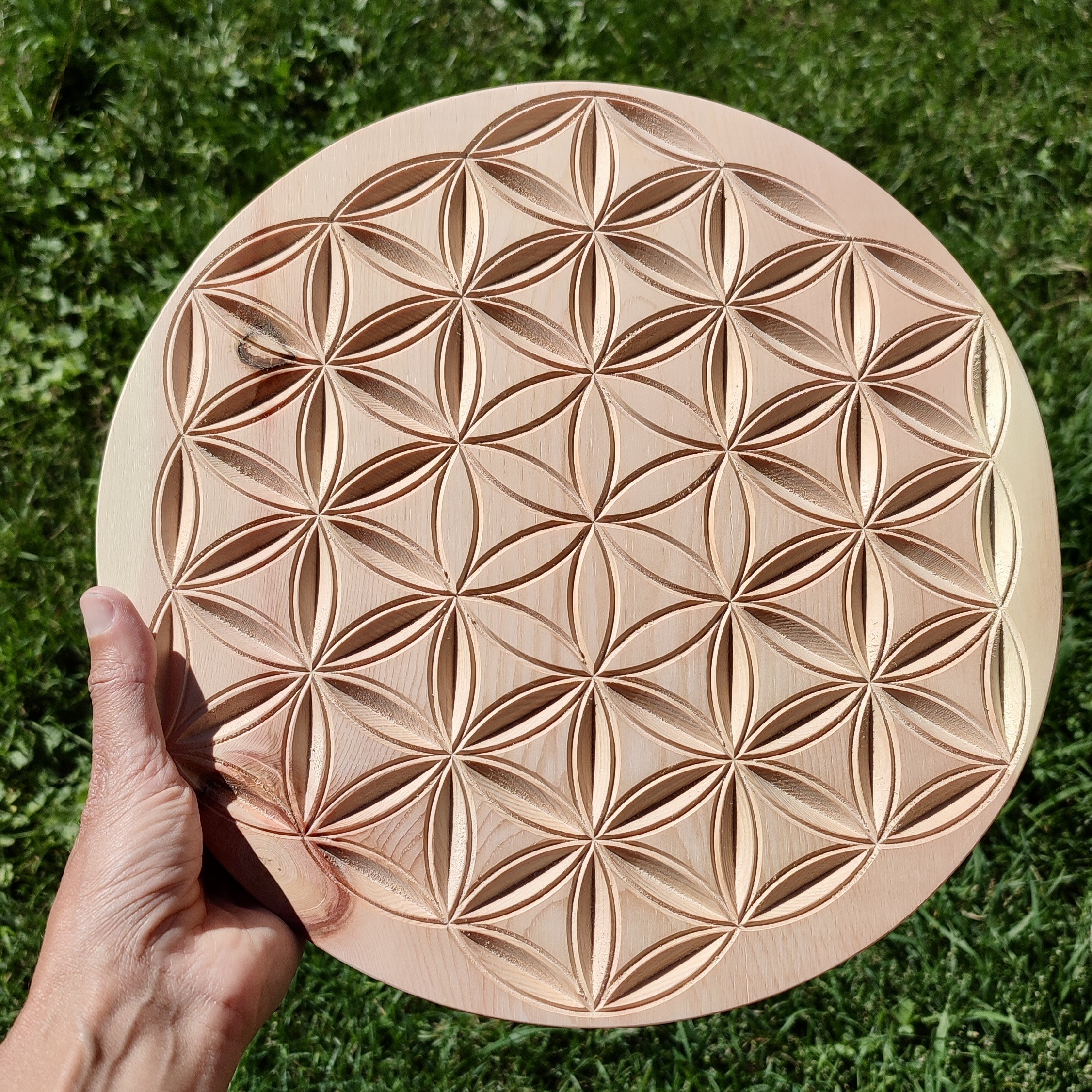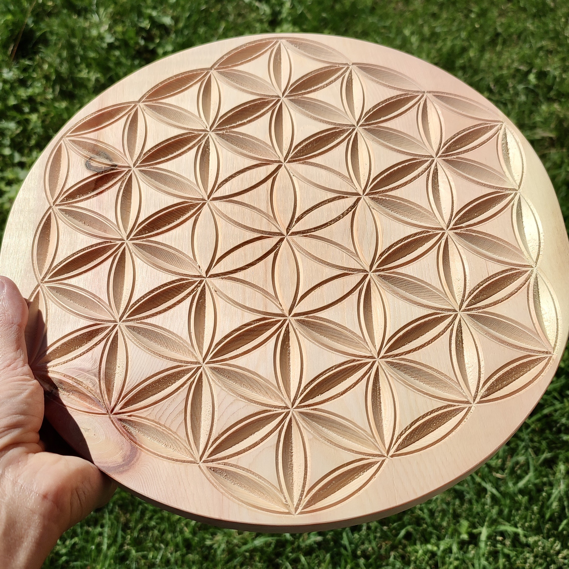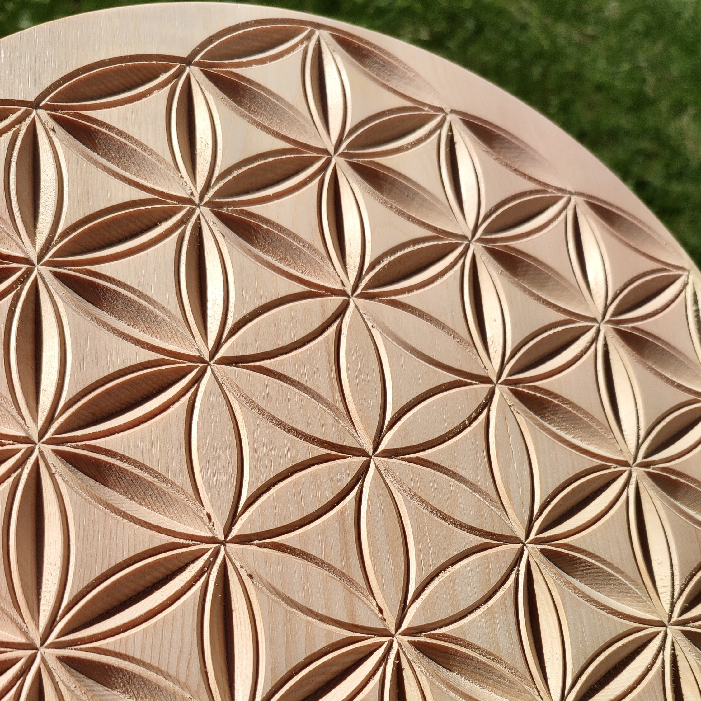 Cette fleur de Vie a été sculptée en Pin Cembro massif est une pièce unique fabriquée en collaboration avec un artisan des Hautes Alpes.