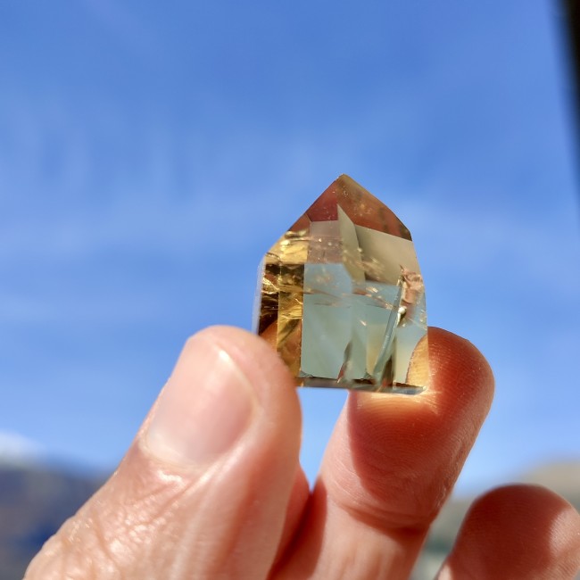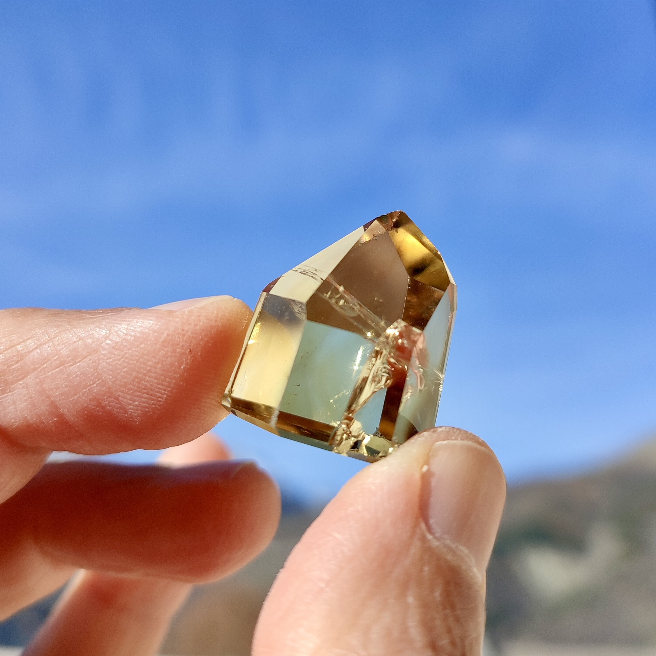 Pointe impeccable, sans éclat. La base de cette citrine naturelle est large et régulière en forme d'octogone, ce qui en fait une pierre un peu plus porté sur l'ancrage, la stabilité, l'enracinement. Son éclat et sa brillance sont vraiment très belles.