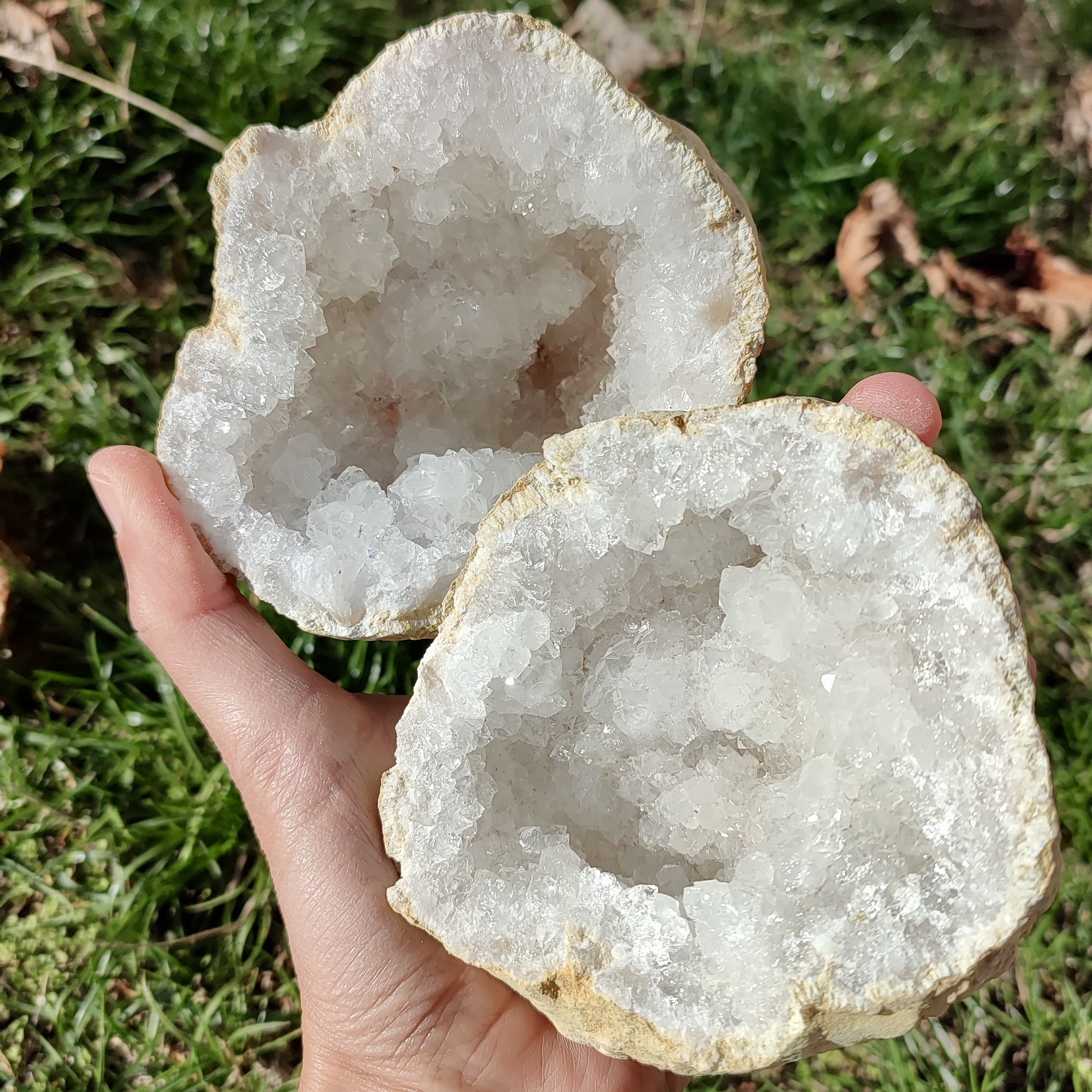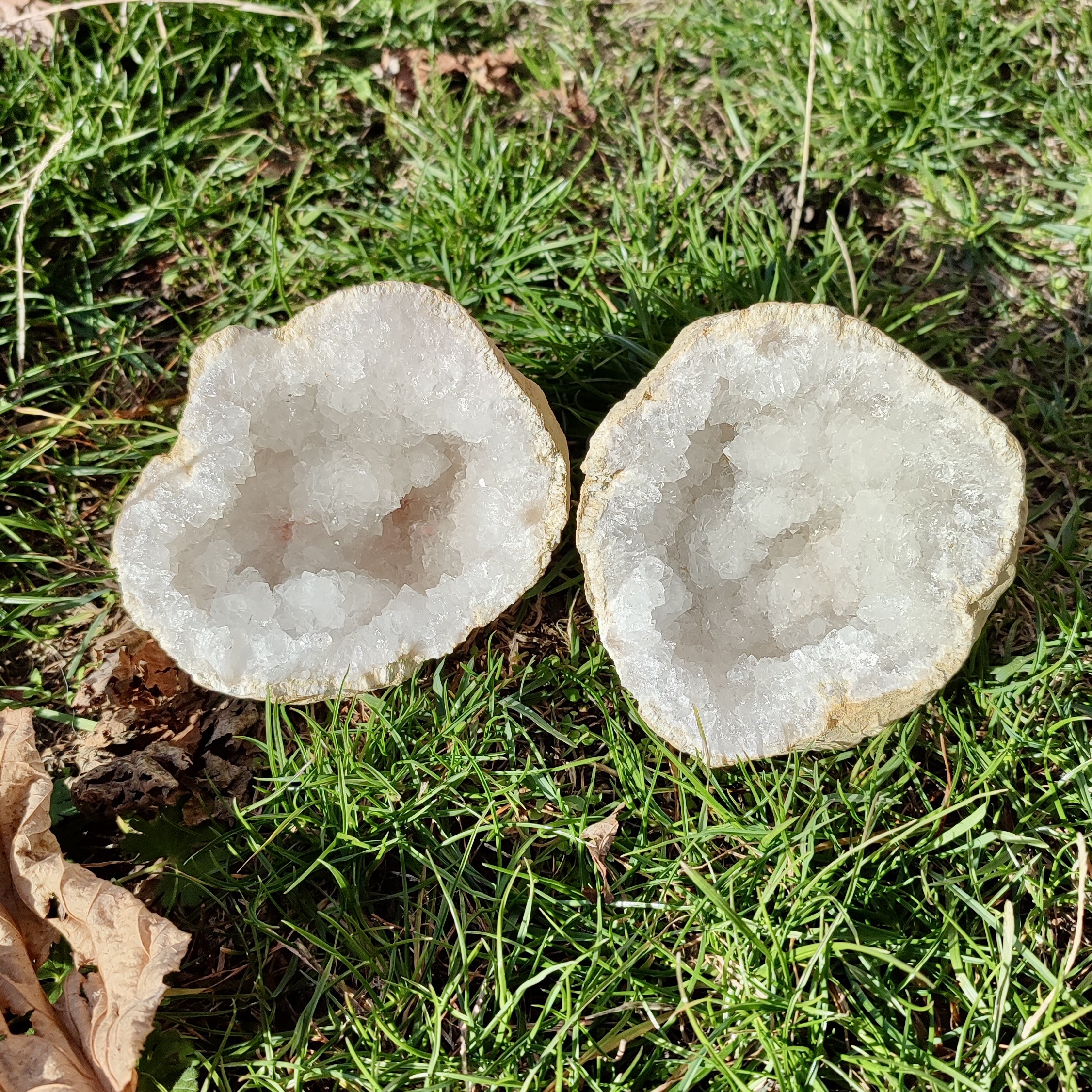 Cette Géode de quartz en cristal de roche en deux morceaux est parfaite pour être installée sur un autel afin créer un espace vibratoire pour activer vos Géométries Sacrées.