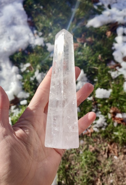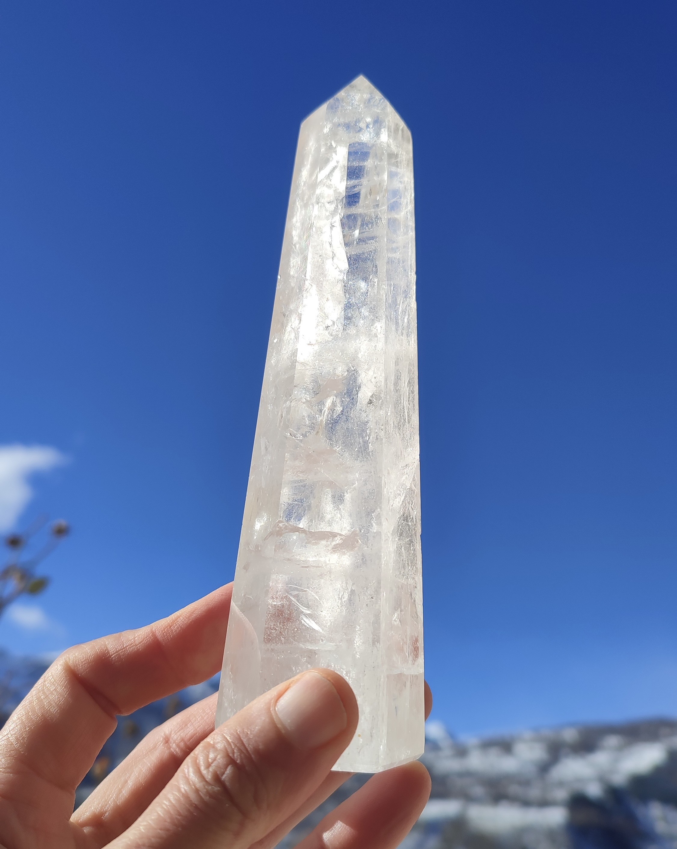 Ce Cristal est juste sublime, il est élancé dans sa verticalité pour une connexion Terre-Ciel optimale, et sa base hexagonale est assez régulière. On peut y voir diverses formes aisni que des arc en ciels. Ce cristal est d'une très belle qualité et d'une grande puissance. Il sera parfait pour vos grilles de cristaux, votre autel ou faire un travail d'élévation personnel.