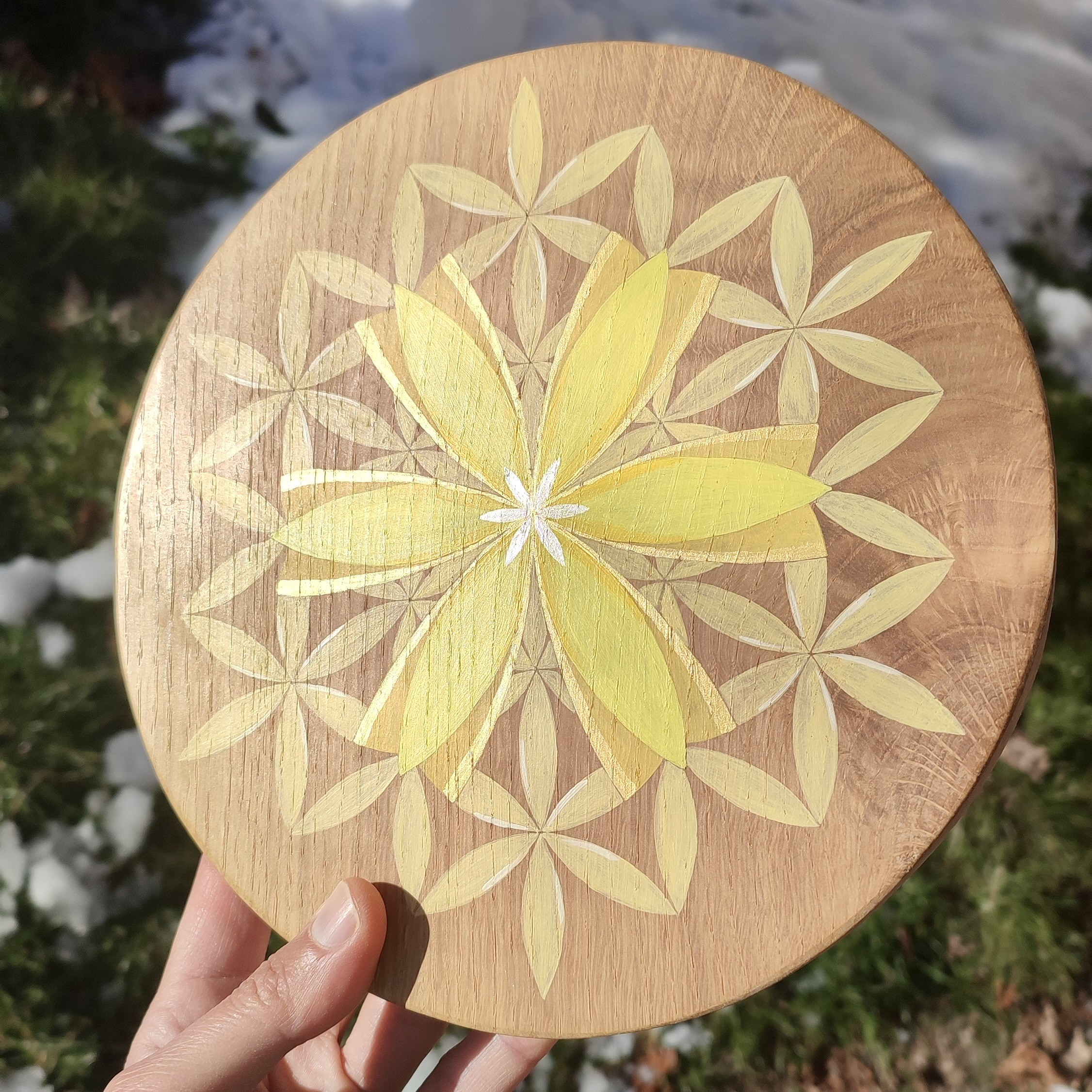 Cette Fleur de Vie en chêne, peinte d’un jaune pâle lumineux, apporte douceur et clarté à votre espace. Au centre, une Graine de Vie se déploie, chaque pétale étant délicatement posé dans un calice doré, prêt à recevoir et amplifier l’énergie que vous souhaitez y déposer.