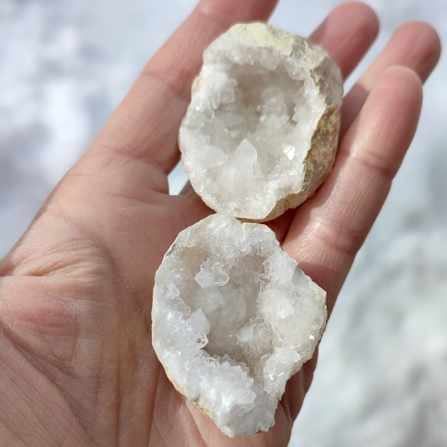Cette petite géode en cristal de roche, naturellement formée et présentée en deux parties, est idéale pour accompagner la recharge et l’harmonisation de petits minéraux ou bijoux.