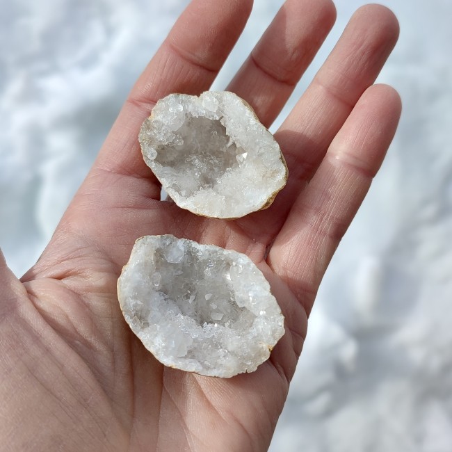 Cette petite géode en cristal de roche, naturellement formée et présentée en deux parties, est idéale pour accompagner la recharge et l’harmonisation de petits minéraux ou bijoux.