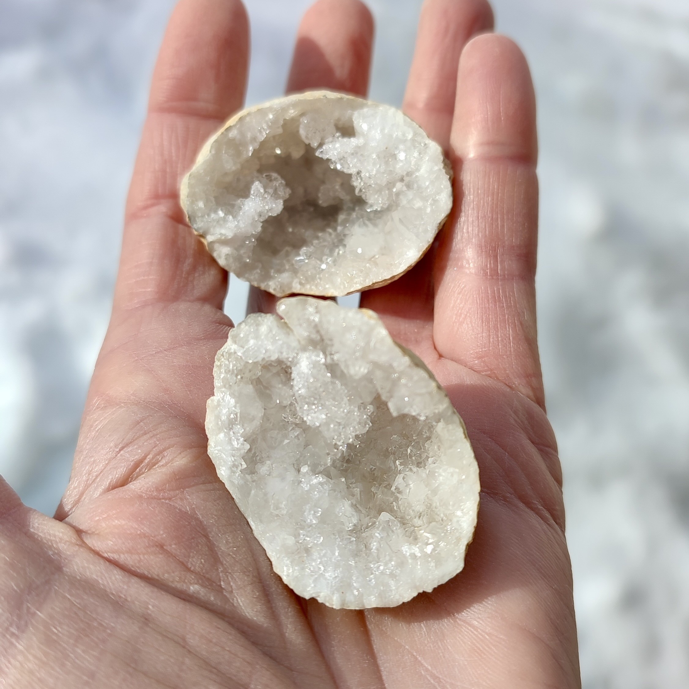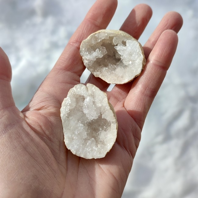 Cette petite géode en cristal de roche, naturellement formée et présentée en deux parties, est idéale pour accompagner la recharge et l’harmonisation de petits minéraux ou bijoux.